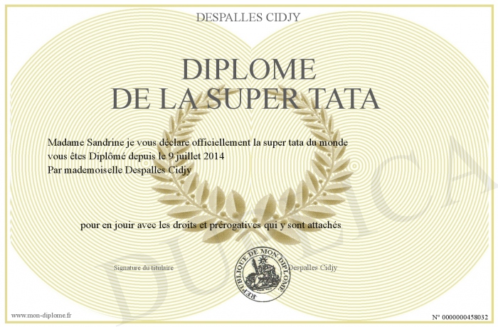 Envoyez par email votre Diplôme de la super tata personalisé