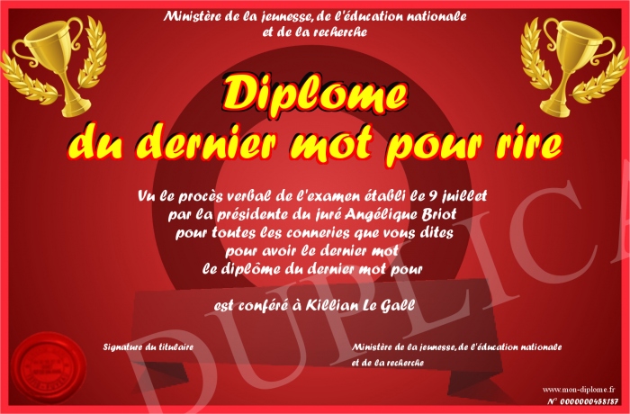 Envoyez par email votre Diplôme du dernier mot pour rire personalisé