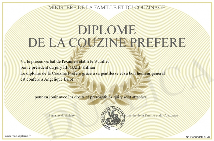 Envoyez par email votre Diplôme de la Couzine Préféré personalisé