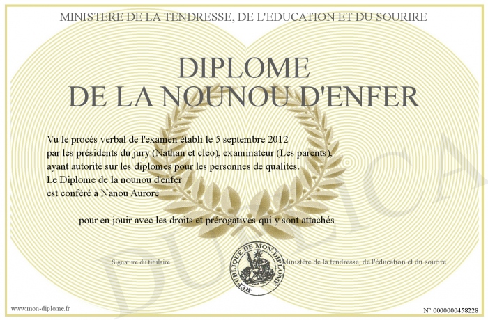 Envoyez par email votre Diplôme de la nounou d'enfer personalisé