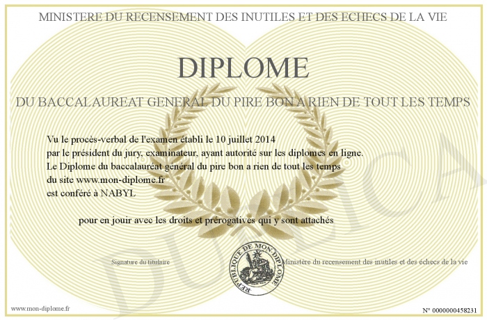 Envoyez par email votre Diplôme du baccalauréat général du pire bon a rien de tout les temps personalisé