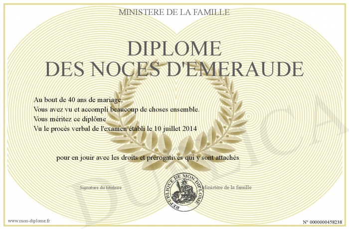 Envoyez par email votre Diplôme des Noces d'Emeraude personalisé