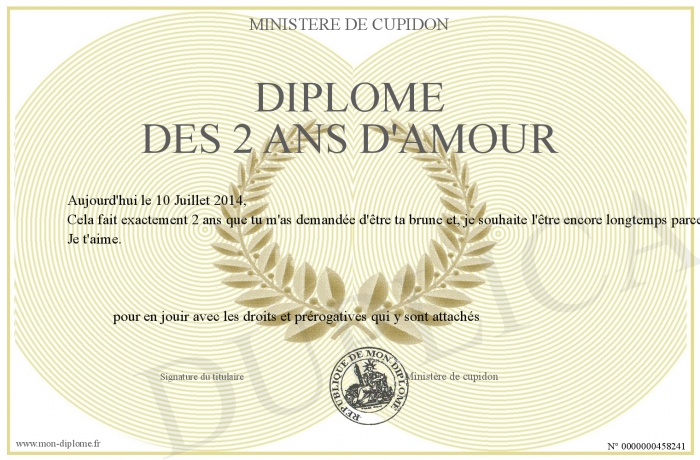 Envoyez par email votre Diplôme des 2 ans d'amour personalisé