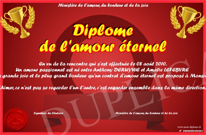Envoyez par email votre Diplôme de l'amour éternel personalisé
