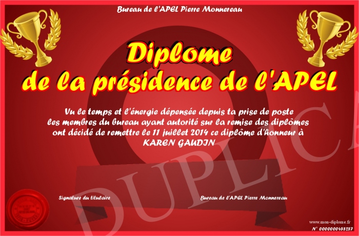 Envoyez par email votre Diplôme de la présidence de l'APEL personalisé