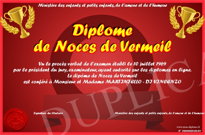 Envoyez par email votre Diplôme de Noces de Vermeil personalisé