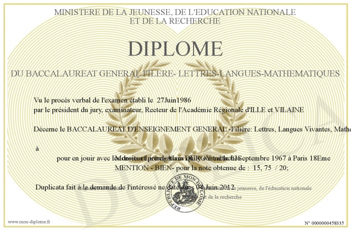 Envoyez par email votre Diplôme du baccalaureat général filère- LETTRES-LANGUES-MATHEMATIQUES personalisé
