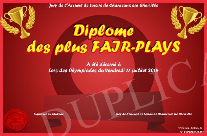 Envoyez par email votre Diplôme des plus FAIR-PLAYS personalisé