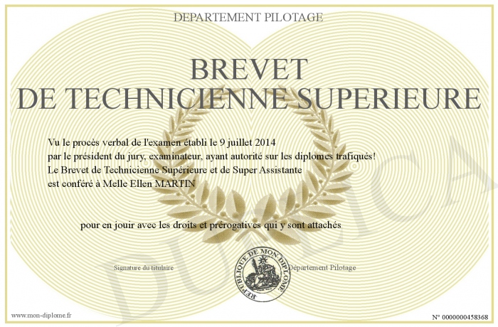 Envoyez par email votre Brevet de Technicienne Supérieure personalisé