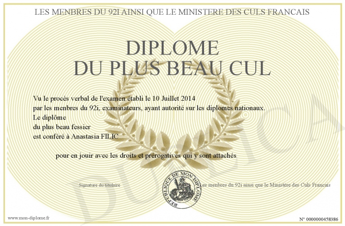 Envoyez par email votre DIPLOME DU PLUS BEAU CUL personalisé