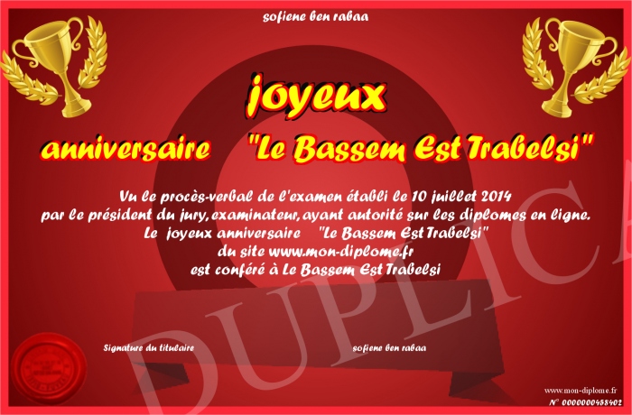 Envoyez par email votre joyeux anniversaire -Le Bassem Est Trabelsi- personalisé