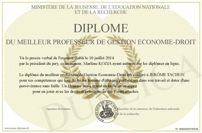 Envoyez par email votre Diplôme du meilleur professeur de Gestion Economie-Droit personalisé