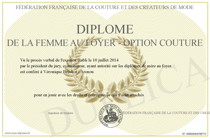 Envoyez par email votre Diplome DE LA FEMME AU FOYER - OPTION COUTURE personalisé