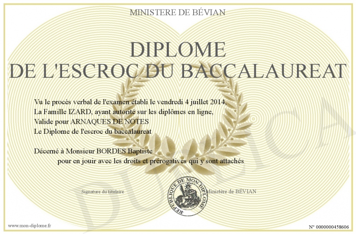 Envoyez par email votre Diplôme de l'escroc du baccalaureat personalisé