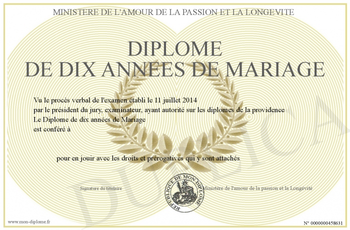 Envoyez par email votre Diplôme de dix années de Mariage personalisé