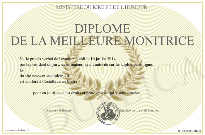 Envoyez par email votre Diplôme de la meilleure monitrice personalisé