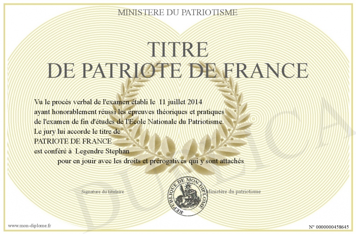 Envoyez par email votre TITRE DE PATRIOTE DE FRANCE personalisé