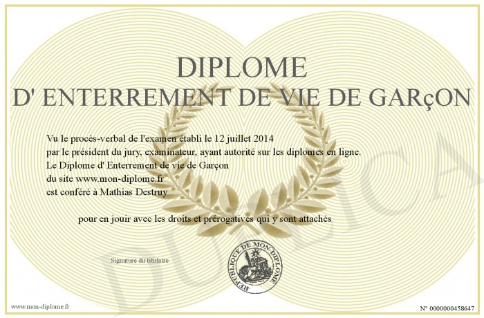 Envoyez par email votre Diplôme d' Enterrement de vie de Garçon personalisé