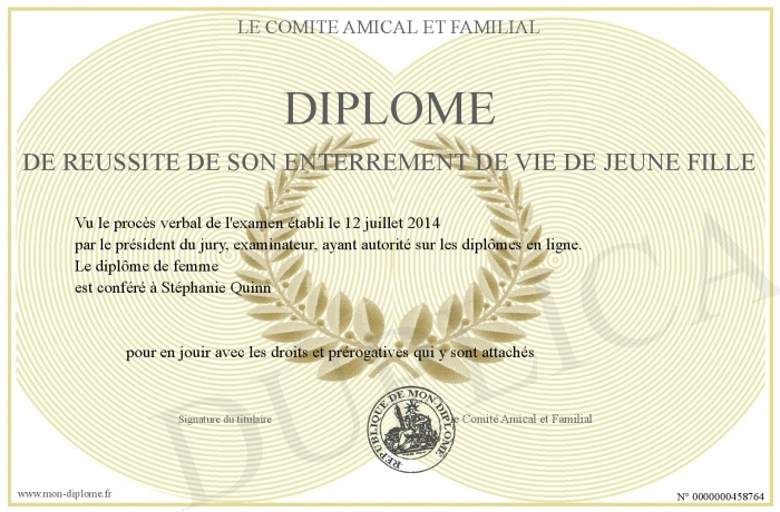 Envoyez par email votre Diplôme de réussite de son enterrement de vie de jeune fille personalisé