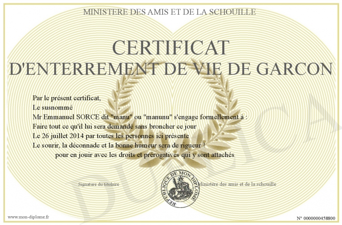 Envoyez par email votre certificat d'enterrement de vie de garcon personalisé