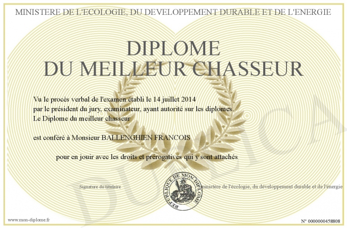 Envoyez par email votre Diplôme du meilleur chasseur personalisé