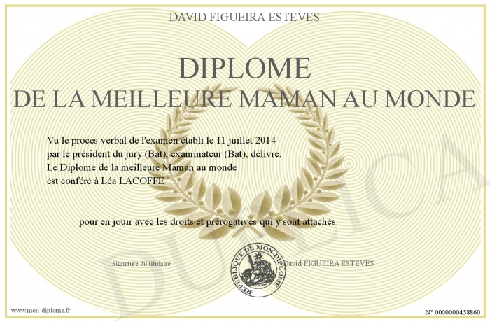 Envoyez par email votre Diplome de la meilleure Maman au monde personalisé