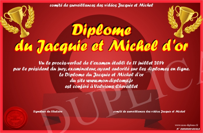 Envoyez par email votre Diplôme du Jacquie et Michel d'or personalisé