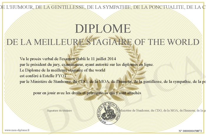 Envoyez par email votre Diplôme de la meilleure stagiaire of the world personalisé