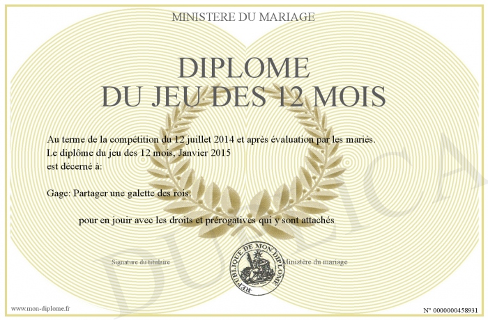 Envoyez par email votre Diplôme du jeu des 12 mois personalisé