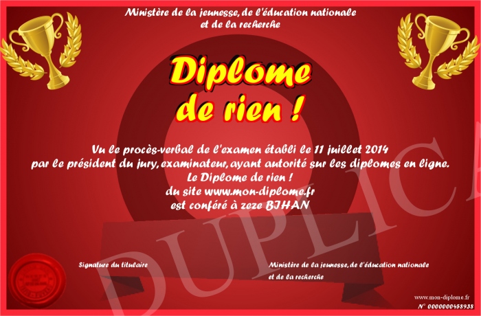 Envoyez par email votre Diplôme de rien ! personalisé