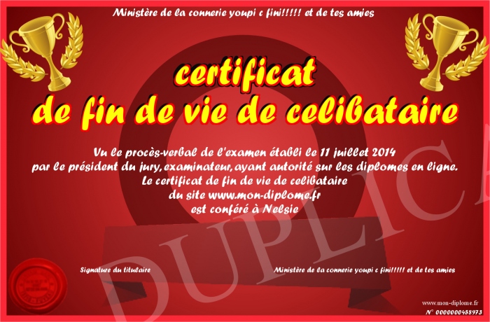 Envoyez par email votre certificat de fin de vie de celibataire personalisé