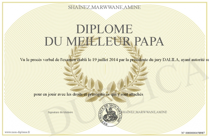 Envoyez par email votre Diplome DU MEILLEUR PAPA personalisé