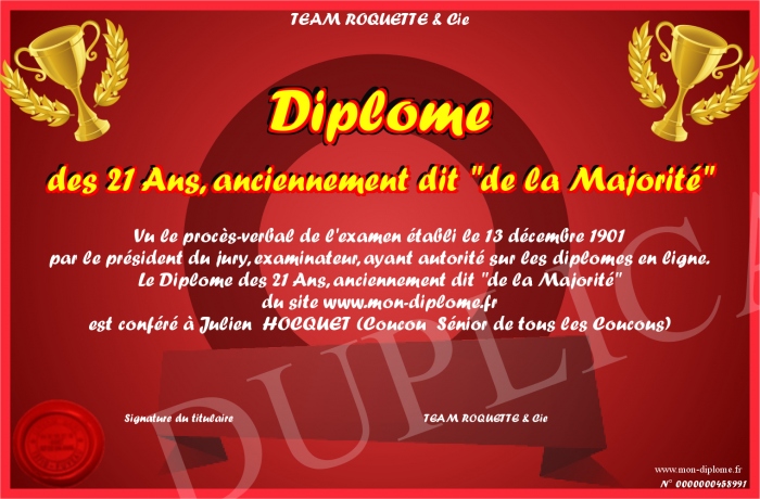 Envoyez par email votre Diplôme des 21 Ans, anciennement dit -de la Majorité- personalisé