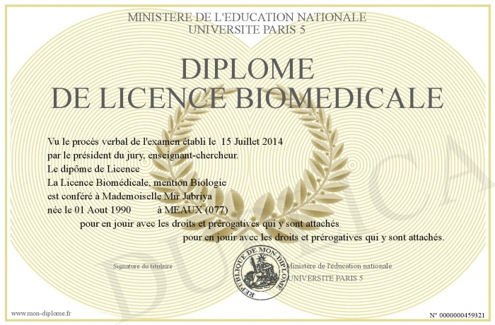 Envoyez par email votre Diplôme de Licence Biomédicale personalisé