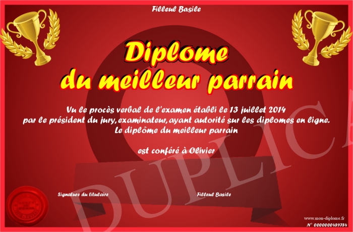 Envoyez par email votre Diplôme du meilleur parrain personalisé