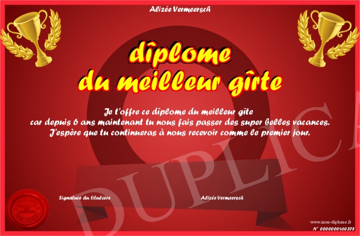 Envoyez par email votre dîplome du meilleur gîrte personalisé