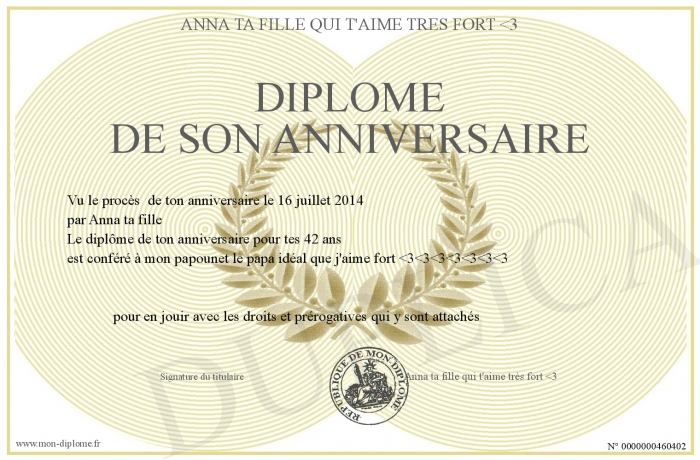 Envoyez par email votre Diplôme de son anniversaire personalisé