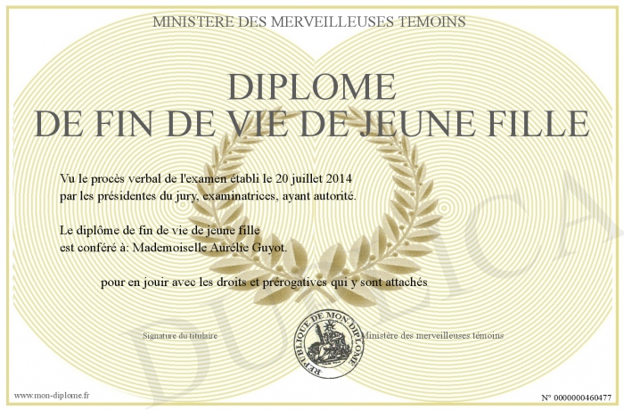 Envoyez par email votre Diplôme de fin de vie de jeune fille personalisé