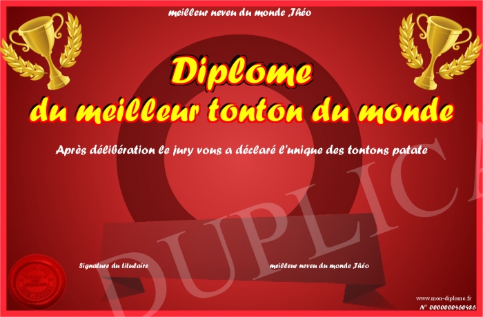 Envoyez par email votre Diplôme du meilleur tonton du monde personalisé