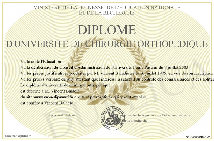 Envoyez par email votre Diplôme d'université de chirurgie orthopédique personalisé