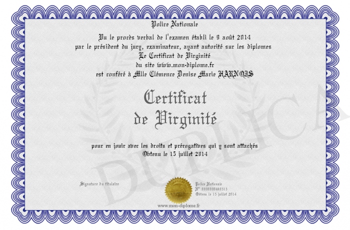 Envoyez par email votre Certificat de Virginité personalisé