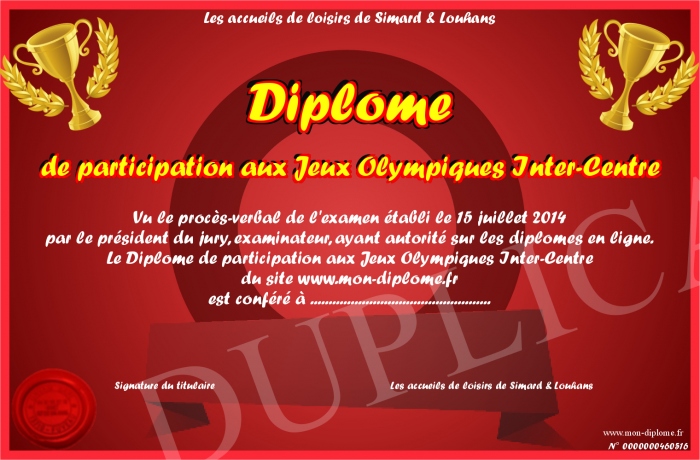 Envoyez par email votre Diplôme de participation aux Jeux Olympiques Inter-Centre personalisé