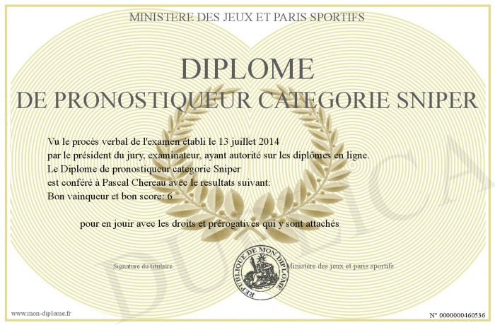 Envoyez par email votre Diplôme de pronostiqueur categorie Sniper personalisé