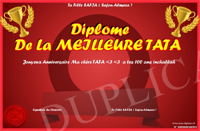 Envoyez par email votre Diplôme De La MEILLEURE TATA personalisé
