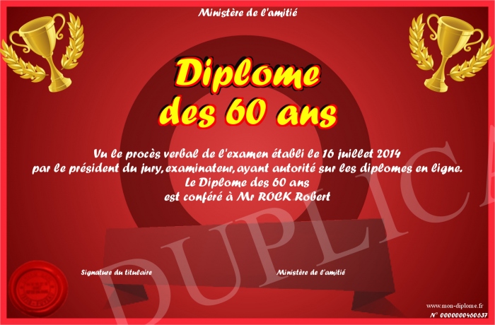 Envoyez par email votre Diplôme des 60 ans personalisé