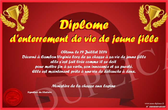 Envoyez par email votre Diplôme d'enterrement de vie de jeune fille personalisé