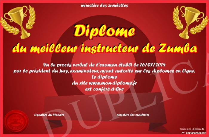 Envoyez par email votre Diplome du meilleur instructeur de Zumba personalisé