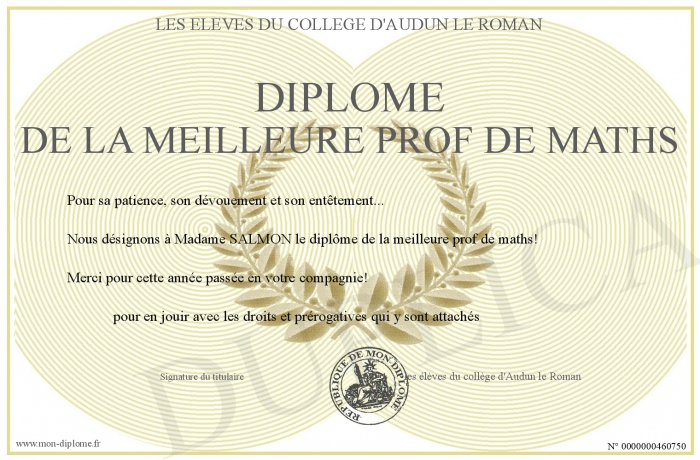 Envoyez par email votre Diplôme de la meilleure prof de maths personalisé