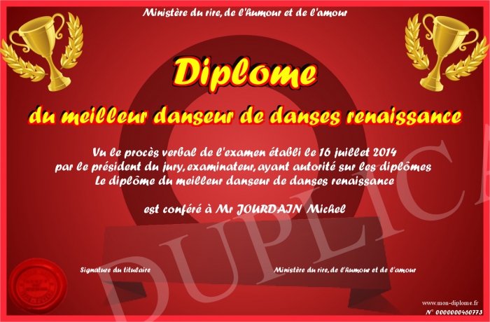 Envoyez par email votre Diplôme du meilleur danseur de danses renaissance personalisé