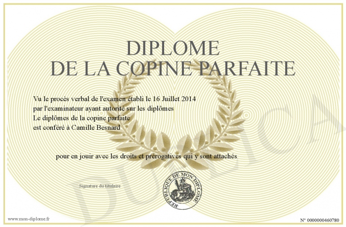 Envoyez par email votre Diplôme de la copine parfaite personalisé